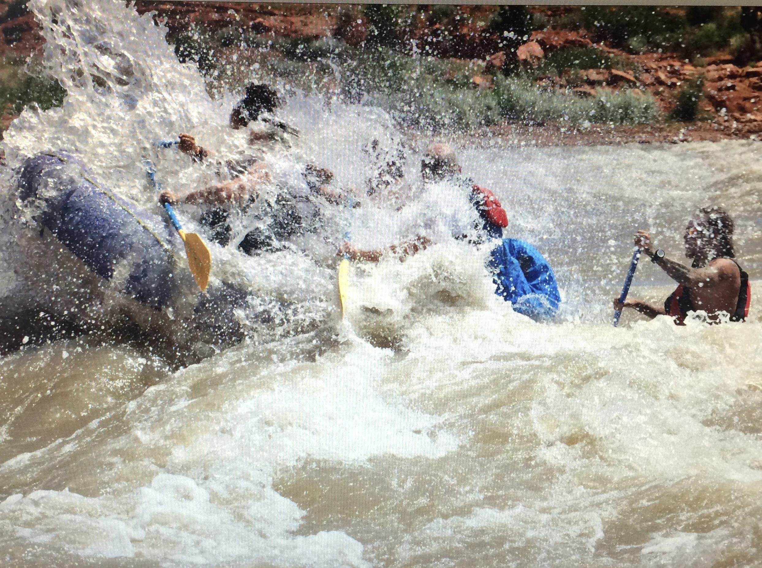 We regrettably check out of Moab Under Canvas, leaving many of its features untested during our wonderful and brief stay. We head into town for the most important meal of the day, grabbing egg mcmuffins and hash browns at McDonald’s. I’m lovin’ it. Today we are white water rafting down the formidable Colorado River, a body of water spanning 1,450 miles and most-famously responsible for the formation of the Grand Canyon. The half day excursion curated by Red River Adventures begins at 8:00 a.m. with a short meeting before busing to the river. Our guide provides color commentary on the way. At the terminus of our tour, we help unload the rafts, are fitted with life vests, learn the dos and don’ts of paddling, and participate in a safety briefing. It’s still early in the season, so the river is moving faster that it will later in the summer. As you may have noticed from the lack of spontaneity in my trips, I’m a planner. I like adventure, but remain averse to risk at home and abroad. As the briefing goes on and we are assigned to boats and guides, I’m beginning to get nervous. But there are young kids doing this (another family of four with young daughters, representing us during our younger and less vulnerable years) and we are strong swimmers. We have experienced guides and personal flotation devices. I tell myself it’s just adrenaline. We’ll be fine, right? The four of us pile into a raft with our tanned, shirtless, nipple-pierced guide at the helm. In the beginning, the ride is exhilarating and lots of fun, driving head on into mild rapids, bouncing down the river, getting wet and wild on this all too real log ride.