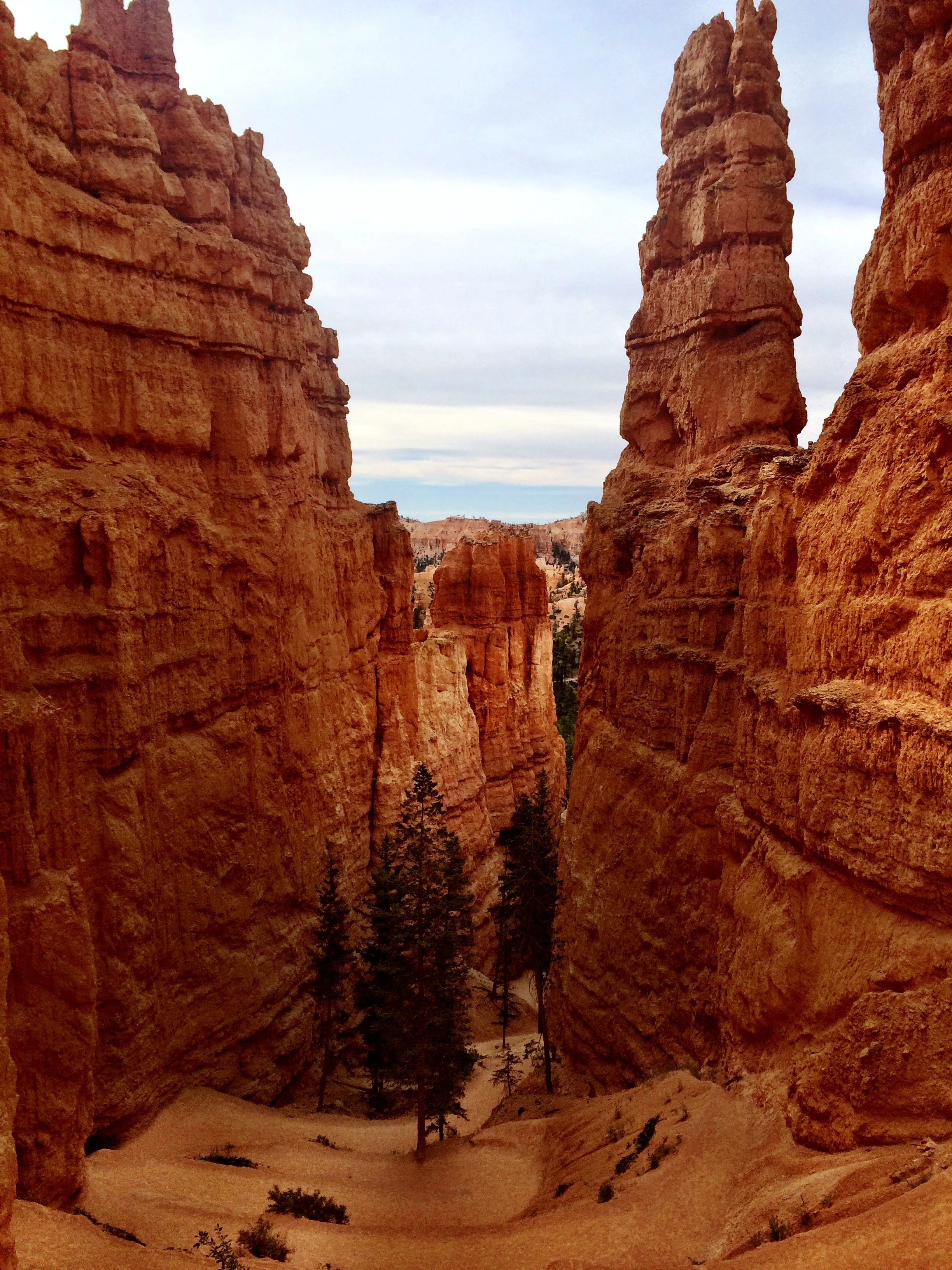 We enjoy a complimentary and delicious breakfast buffet in the lodge’s spacious dining hall before heading back to Bryce for a bit of hiking and sightseeing. Navajo Trail is one of the more popular trails and can be combined with the Queens Garden Trail to create a longer, more varied loop. Full and fatigued, we stick to the moderate(ish) 1.3 mile Navajo Trail Loop, which begins at Sunset Point and heads into Bryce Amphitheater through a slot canyon where fir trees stretch to reach the sunlight above. This route offers the opportunity to walk among the sculpture garden of towering hoodoos. Its final ascent (initial descent for some, since you can hike the loop in either direction) out of the canyon makes use of several short and steep switchbacks as you exit the Wall Street section, named for its tall canyon walls resembling skyscrapers. Park elevations reach over 9,000 feet. Even mild exertion may lead to lightheadedness and nausea. As we hiked, I definitely felt the altitude. Make sure to carry plenty of water since the body is more susceptible to dehydration at high altitude.