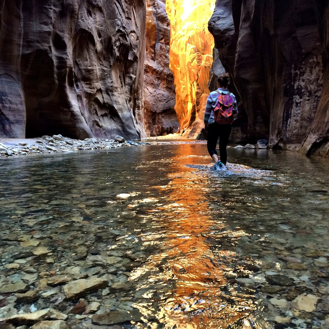 A few less than fashionable suggestions: wear waterproof shoes or sneakers you don’t care about. It also behooves you to dress in layered clothing. You are fording a river for the duration of the hike, with cold water sometimes reaching as high as your thighs. And in the morning, the tall walls of the gorge throw shade on The Narrows.